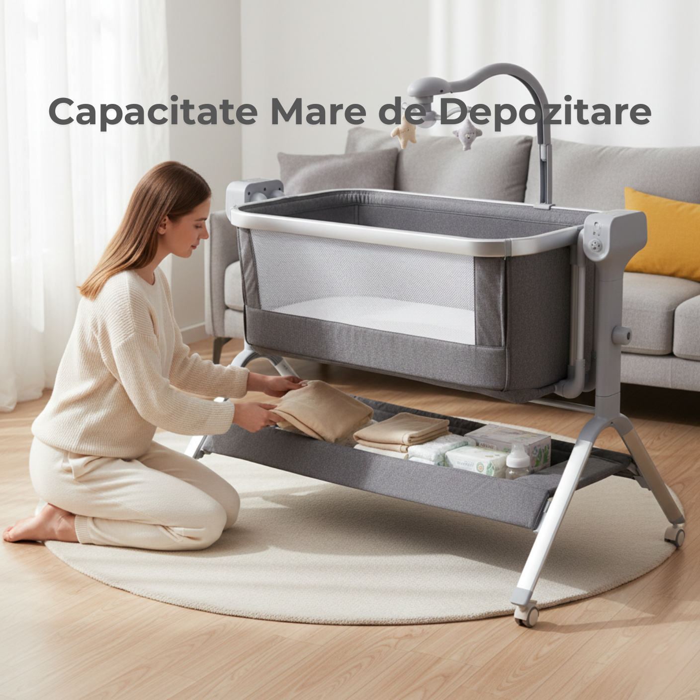 Știm că igiena este vitală. Husa saltelei este detașabilă și poate fi spălată la mașină (recomandăm program delicat la 30°C). Părțile textile ale coșului și cadrul din aluminiu/plastic pot fi șterse ușor cu o lavetă umedă și un detergent neutru.